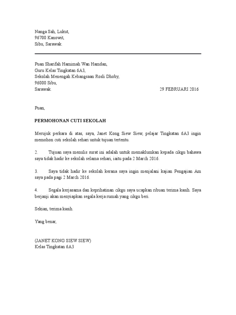 Surat Memohon Cuti Sekolah Untuk Anak Kimaku