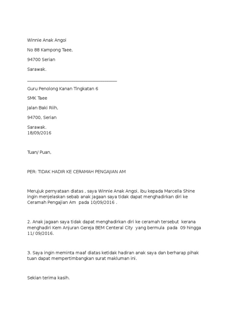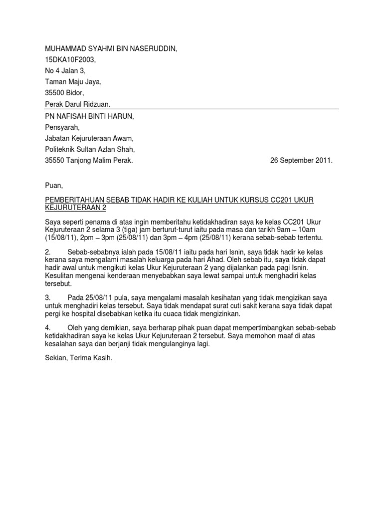 Contoh Surat Rasmi Tidak Hadir Ke Sekolah 1 Pdf